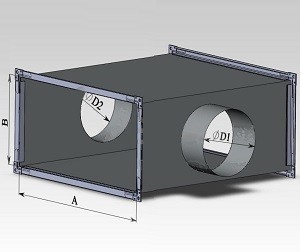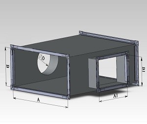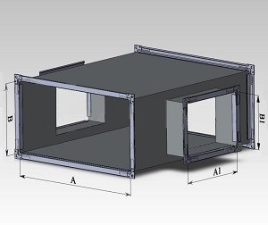 Прямоугольная с фланцами, одной прямоугольной врезкой и одной круглой врезкой